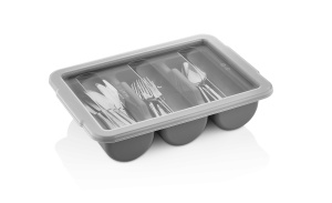 Емкость для столовых приборов (40*29*9,5 см) из полипропилена на 3 секции. Удобные ручки обеспечивают надежный хват. Возможность штабелирования экономит место при хранении. Подходит для мытья в посудомоечной машине.